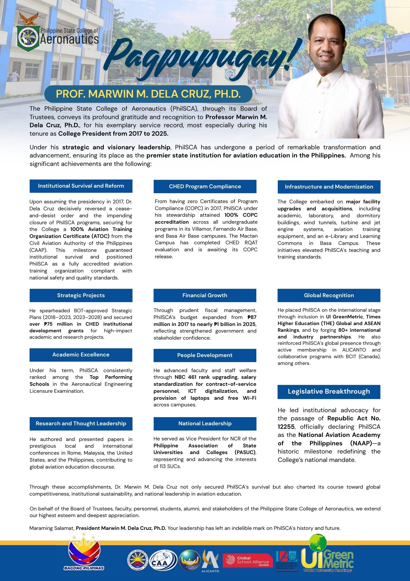 The Philippine State College of Aeronautics (PhilSCA), through its Board of Trustees, conveys its profound gratitude and recognition to Professor Marwin M. Dela Cruz, Ph.D., for his exemplary service record, most especially during his tenure as College President from 2017 to 2025.