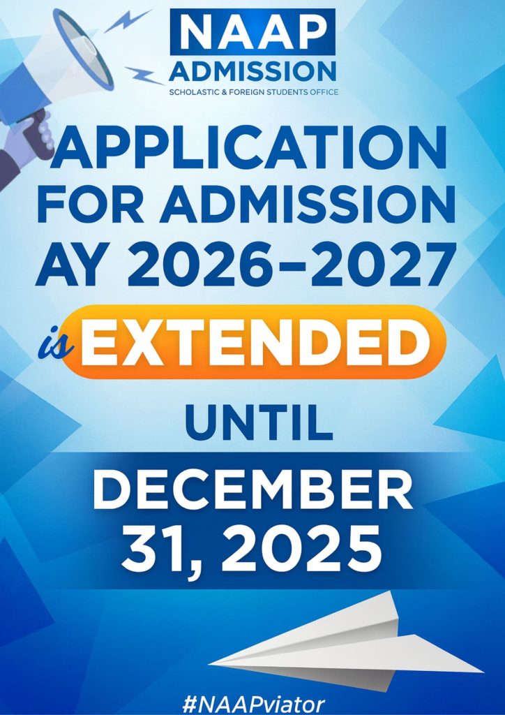 The NAAP Admission Office wishes to inform all aspiring students that the online application period is now extended until December 31, 2025.All applicants are requested to ensure the completeness of their requirements prior to submission.