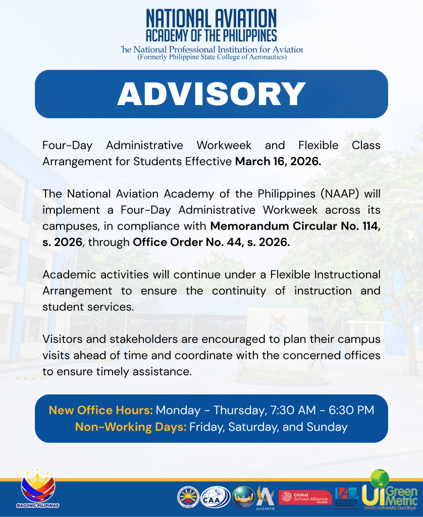 𝐅𝐨𝐮𝐫-𝐃𝐚𝐲 𝐀𝐝𝐦𝐢𝐧𝐢𝐬𝐭𝐫𝐚𝐭𝐢𝐯𝐞 𝐖𝐨𝐫𝐤𝐰𝐞𝐞𝐤 𝐚𝐧𝐝 𝐅𝐥𝐞𝐱𝐢𝐛𝐥𝐞 𝐂𝐥𝐚𝐬𝐬 𝐀𝐫𝐫𝐚𝐧𝐠𝐞𝐦𝐞𝐧𝐭 𝐟𝐨𝐫 𝐒𝐭𝐮𝐝𝐞𝐧𝐭𝐬, 𝐄𝐟𝐟𝐞𝐜𝐭𝐢𝐯𝐞 𝐌𝐚𝐫𝐜𝐡 𝟏𝟔, 𝟐𝟎𝟐𝟔 (𝐌𝐨𝐧𝐝𝐚𝐲) The National Aviation Academy of the Philippines (NAAP) will implement a Four-Day Administrative Workweek across its campuses, in compliance with Memorandum Circular No. 114, s. 2026, through Office Order No. 44, s. 2026. Academic activities will continue under a Flexible Instructional Arrangement to ensure the continuity of instruction and student services. Visitors and stakeholders are encouraged to plan their campus visits ahead of time and coordinate with the concerned offices to ensure timely assistance.