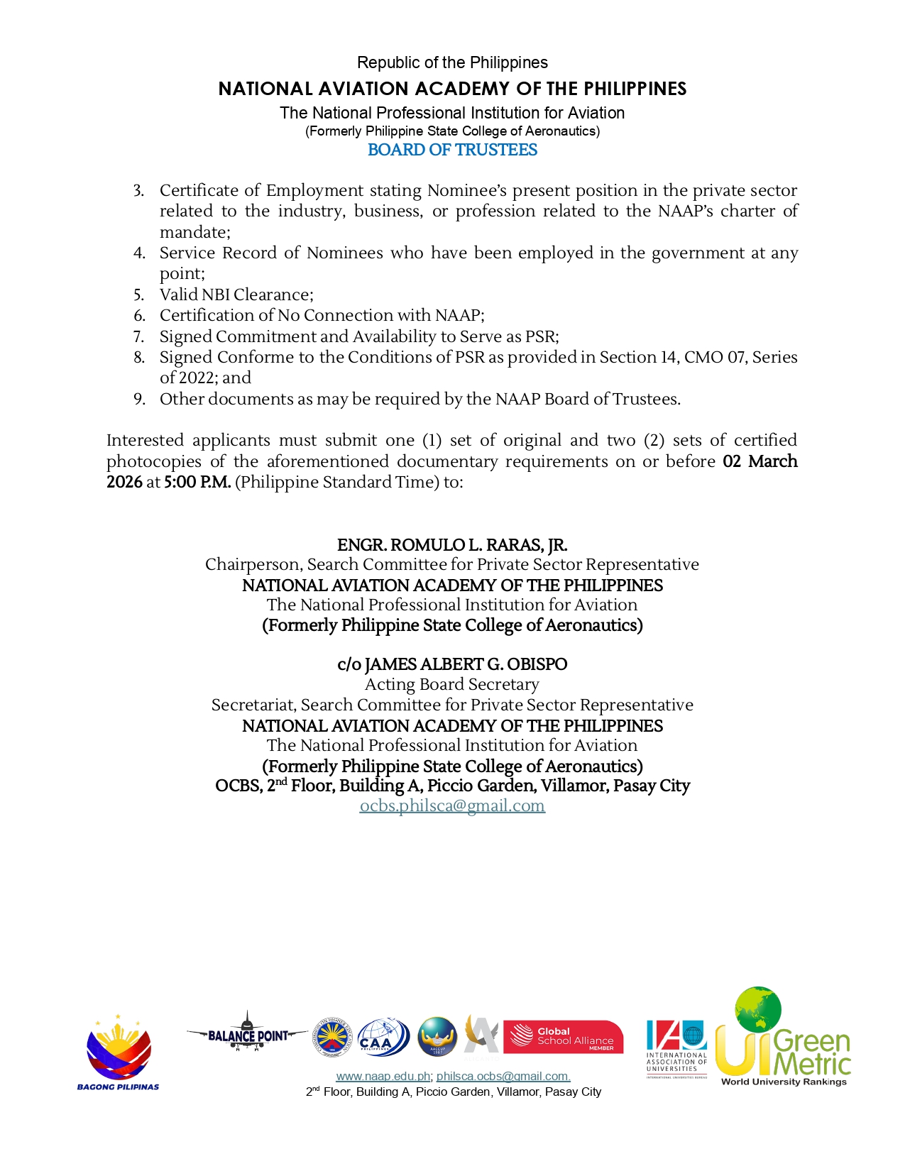 Submission of the Requirements for the Applicants of the Search for one (1) NAAP Private Sector Representative is open until March 2, 2026 pursuant to BOT Resolution No. 25-NAAP, Series of 2026.